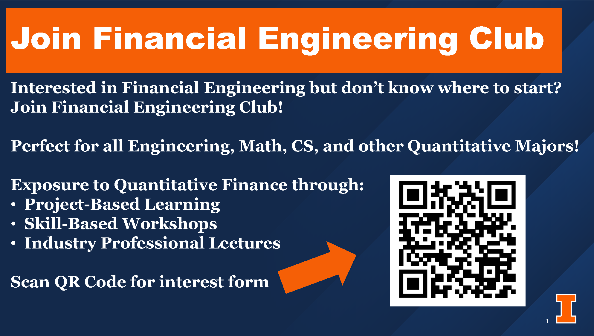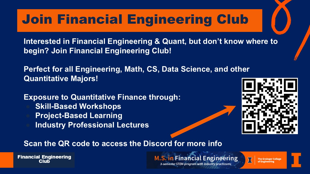 The Financial Engineering Club at UIUC, in collaboration with the MS Financial Engineering program, strives to bridge the gap between academic theory and technical practice, equipping students with hands-on experience through real world projects in quantitative finance. By fostering awareness of emerging financial landscapes and emphasizing coding implementation, the club enables members to apply theoretical knowledge to practical scenarios. Through collaborative projects, presentations from leading professionals, and skill-building workshops, the club cultivates an environment where students refine their technical expertise, articulation of complex tools and methods, and commitment to ethical competence. The goal is to empower members with the insights, skills, and networks essential for success in the dynamic world of financial engineering. All students with a quantitative background at UIUC (Engineering, Computer Science, Finance, Physics, etc.) with an interest in financial engineering or quantitative finance are encouraged to join the club.